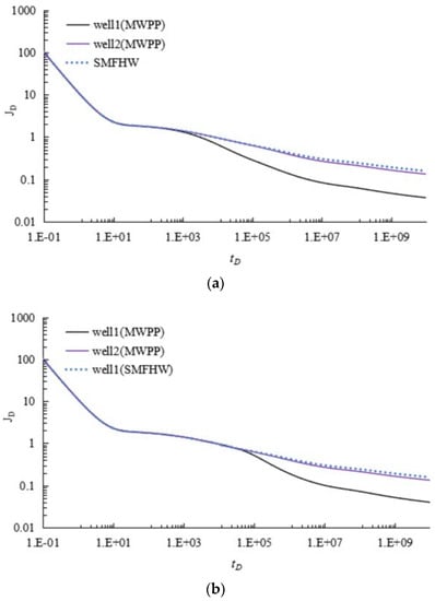 This section can clearly demonstrate the existence of multi-well pressure interference in WIPS by using the transient-pressure analysis. Furthermore, to analyze the well performance in WIPS with the influence of multi-well pressure interference, Figure 8 illustrates the dimensionless multi-well productivity index. Comparing to the SMFHWs, the well performance severely decreases. Figure 8 also shows that the different location of fractures leads to different occurrence periods of multi-well pressure interference.