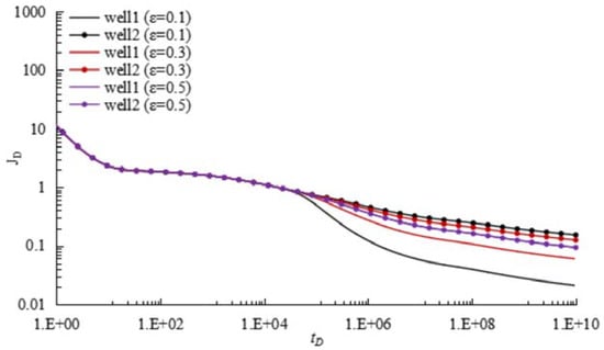 We set ε to be 0.1, 0.3, 0.5 respectively. Figure 9 shows effects of ration of well rate on pressure performance for WIPS scheme. We can judge the occurrence of MWPI by whether the MPI curves of two wells overlap together. The smaller the well rate, the more severely the curves are distorted. Moreover, the smaller the well rate, the smaller the dimensionless multi-well productivity index. Therefore, we can judge the well rate of two wells based on the relative position of the MPI curves. We also can summarize that the ratio of well rate ε approximately has no any influence on the time when the MWPI occurs.