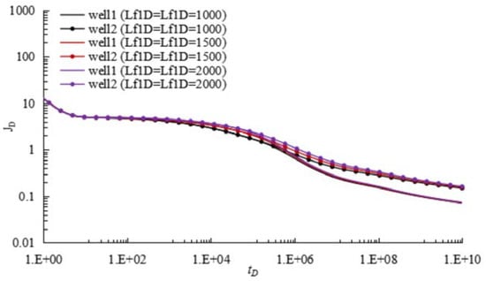 In this section, we conduct some sensitivity analysis on MPI for WIPS scheme. The key factors that influence MPI for WIPS scheme include hydraulic fracture half-length LfD, hydraulic fracture conductivity CfD, hydraulic fracture spacing Lf12D, well spacing LwD, ratio of well rate ε, stress sensitivity ζD. Some dimensionless parameters can be: S = 0.2, CD = 10, ζD = 0.05, λ = 0.002, γ = 0.15, ω = 0.0035, CηD = 105, Lf1D = 2000, Lf2D = 2000, LwD = 3000, Lf12D = 1000. Cf1D = 50, Cf1D = 50. The results are discussed in detail as follows: