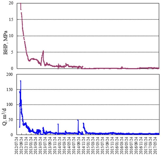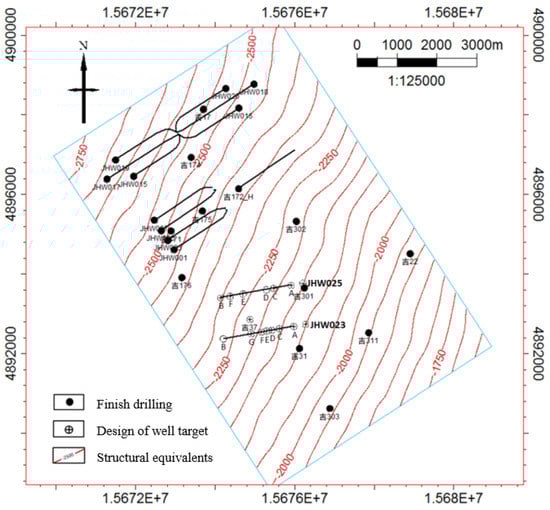 In this section, we try to apply our methodology to a realistic case, Xinjiang Changji Oilfield is located in the east of the Zhungeer Basin, with an area of 1278 km2 and 150 km away from Urumqi, administrative district belongs to the Jimsar County of Xinjiang Uygur Autonomous Region. According to drilling data, the formation thickness of the area is 28–75 m, an average of 53.5 m, The average porosity of the reservoir is 10.99% and the permeability is 0.012 mD, which belong to the typical tight oil reservoir. To improve the oil recovery, well-industry-production-scheme (WIPS) is used, the illustration of the WIPS can be found in Figure 14. Because of some policy limitation, more detailed information cannot be specified. Our target wells are located at the north-west corner. This WIPS has 6 horizontal wells. Some fracturing parameters can be found in Table 2. Figure 15 shows the production scheme of the well JHW015, the production profile of other wells do not show here.