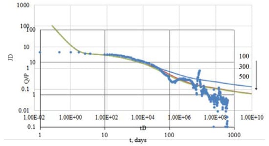 Given the specific parameters, including fracture length, number of fractures, well length, formation permeability, we estimate the well distance approximately using our proposed semi-analytical method. Here, we take the well JHW015 as an example to explain how to use our method. To begin with, the productivity index can be calculated using the historical production data, as Figure 15. Second, given some known parameters, several dimensionless productivity index curves can be plotted based on different well distance. Finally, we can match those curves to approximately estimate the possible well distance in this well-industry-production-scheme (WIPS). As one can see in Figure 16, at the early production stage, this is the fracturing fluid drawback from the formation with two-phase flow, as result, our model cannot match with this data, thus, we should avoid use the production data at the early production period. Based on the matching results of type curves, the well distance is slightly bigger than 500 m.