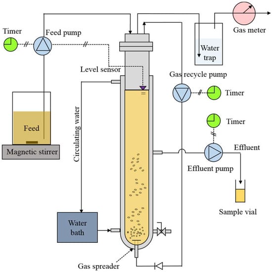 Each ASBR unit was made from a glass column with an inner diameter of 8 cm and a height of 70 cm (Figure 1). The bioreactors, with a total volume of 3.5 L, were operated at a working liquid volume of 2 L. Each reactor was entirely covered with a black foam sheet in order to prevent the photosynthetic activities from both algae and bacteria. The temperature in the ASBR unit was controlled by a water circulating bath via a water jacket on each bioreactor. The ASBR operation consisted of the four sequential steps of feed, react, settle, and decant, all of which were controlled by a set of digital timers. For the feed step (2 min), the ethanol wastewater was pumped into the top of the bioreactor using a peristaltic pump with a level probe. For the react step (116 min), the feed pump was turned off and another peristaltic pump was turned on to recycle the produced biogas at the top of the ASBR to the bottom of the ASBR column to achieve a homogeneous mixing of the bioreactor’s liquor, using a biogas flow rate of 0.25 L/min. For the settle step (120 min), the biogas recirculation was stopped so as to allow for the microbial cells to settle in the bioreactor. For the final decant step (2 min), the clarified effluent was drained out of the bioreactor by a peristaltic pump that was equipped with a level probe. The ASBR was operated at 6 cycles/d, as previously reported []. Each ASBR unit was operated at the given COD loading rate at either 37 or 55 °C until reaching a steady state, which was around four weeks. The steady state was determined as the onset of relatively constant values (standard deviation < 5%) of both the gas production rate and the effluent COD value over time. Then, the biogas and effluent samples were collected for analysis and measurement.