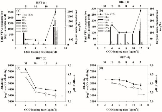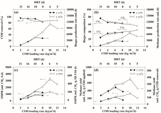 As shown in Figure 2a,b, the biogas and the CH4 production rates increased with increasing COD loading rates up to a maximum at a COD loading rate of 6 or 10 kg/m3d for the mesophilic or thermophilic temperature, respectively. Beyond these optimum COD loading rates, the biogas and CH4 production rates decreased markedly with increasing COD loading rates. Interestingly, when the ASBR system was operated at a COD loading rate that was lower than 6 kg/m3d, the process performance, in terms of both the COD removal efficiency and biogas production rates, were more or less the same at both of the temperatures, because the systems were under a low range of organic loads. The increased COD loading rate caused an increased level of organic substrates that are available for conversion to biogas, resulting in increased biogas and CH4 production rates. However, for either operational temperature, increasing the COD loading rate above the respective optimum value led to a reduction in both the biogas and CH4 production rates because of the increased toxicity of the accumulating VFAs (Section 3.3), as mentioned before. The thermophilic operation provided a higher optimum organic loading rate with a much higher biogas and CH4 production rates than the mesophilic operation, which is in good agreement with a previous investigation [].