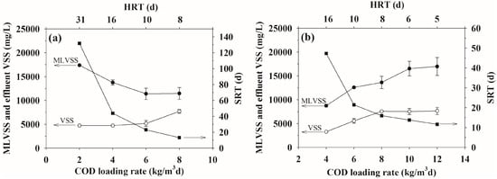 The microbial concentration (MLVSS), effluent volatile suspended solids (VSS) and solids retention time (SRT) at different COD loading rates and HRT in the ASBR operated under a (a) mesophilic (37 °C) or (b) thermophilic (55 °C) temperature. Data are shown as the mean ± 1SD, derived from 5 independent repeats.