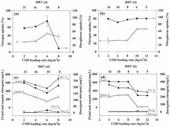 Nitrogen is basically found in both organic and inorganic forms, including NH4+-N, NO3−-N, and NO2−-N, which can be taken up by the bacteria during AD []. As shown in Table 2, most N in the ethanol wastewater was in the form of org-N (80–90%), with a N:P ratio of about 4:1. As shown in Figure 5a, the uptakes of both N and P in the mesophilic ASBR system increased with increasing COD loading rates to maximum values (44% for N uptake and 75% for P uptake) at the optimum COD loading rate (6 kg/m3d). Above this optimum COD loading rate, the N, and especially the P uptake level, decreased markedly. The N and P uptake profiles corresponded well to those of methanogenic activity in terms of the CH4 production rate, SMPRs, and CH4 yields. As shown in Figure 5b, for the thermophilic ASBR system, the N uptake remained very low (27%) at a COD loading rate of 4–8 kg/m3d and rose abruptly to 55% at the optimum COD loading rate of 10 kg/m3d, while the P uptake did not vary significantly and it was relatively high (about 95%) throughout the studied range of COD loading rates. Above the optimum COD loading rate, both the N and P uptake levels remained almost constant. At each respective optimal COD loading rate, the N and P uptake levels of the thermophilic ASBR were significantly higher than those of the mesophilic ASBR, which corresponded well to the methanogenic activity results. Interestingly, the uptake ratios of N to P at the optimum COD loading rates for the mesophilic and thermophilic operation were not significantly different.