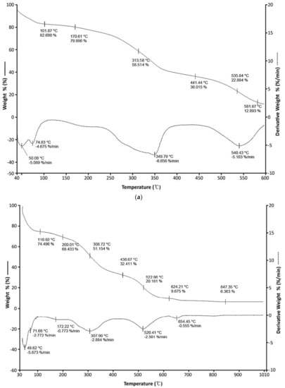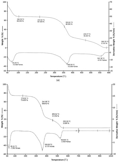 Figure 2a,b show TGA and DTG results for sawdust. The weight is reduced as moisture is evaporated at temperatures below 100 °C. If this range is excluded, there are two decomposition ranges: one from 275 °C to 360 °C, and another from 500 °C to 550 °C. Weight reduction in the range of 275 °C to 360 °C seems to be the result of hemi-cellulose decomposition [5,21] and lignin decomposition, which takes place gradually over temperatures ranging from 160 °C to 900 °C [22]. According to the thermal degradation behavior of pine sawdust in Ningbo Gao [23], hemi-cellulose decomposition took place at temperatures ranging from 225 °C to 375 °C, similar to the results found in this study. In the range of 500 °C to 550 °C, like the findings of Ulloa et al. [24], TGA-DTG results from coal and in radiated pine sawdust blend, weight reduction could be explained by the transition into aliphatic or aromatic compounds due to char decomposition and lignin volatilization.