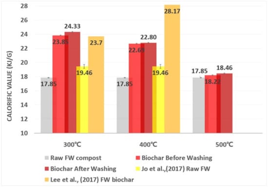 Figure 5 compares the calorific values of food waste compost biochar, pre-pyrolysis raw material compost, and the food waste calorific values of Lee et al. [12] and Jo et al. [15]. Food waste compost showed 17.85 kJ/g, a lower calorific value than raw food waste 19.46 kJ/g, because the organic matter in food waste was degraded. As a result, the substances that increase the calorific value (e.g., carbon) was relatively lower. After pyrolysis, food waste compost has increased in the calorific value compared with raw food waste compost as the pyrolysis temperature changes from 300 °C to 500 °C. Considering a large amount of organic matter was degraded by microorganisms, the calorific value did not show a large decrease; sawdust played a supporting role. In fact, Chen and Leung [31] showed that sawdust had a calorific value of 18.064 kJ/g.