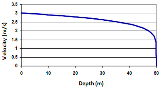 where z is the distance above the bottom, p the depth, the speed of the current at the surface. In fact, the maximum speed is usually located slightly below the free surface. Figure 3 shows the variation curve according to this law for a channel 50 m deep.