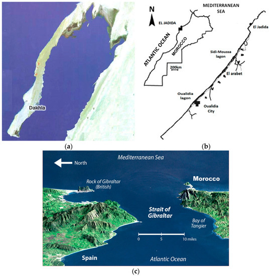 Potential areas for tidal power generation in Morocco. (a) Dakhla bay (23°30′ N; 16° W) [31]; (b) Oualidia lagoon (32°45′ N; 9°3′ W) [32]; (c) The southern coast of the Strait of Gibraltar [33].