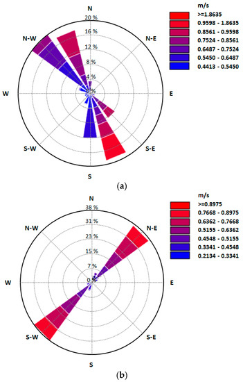 Whatever the type of high and low water tides, the tidal currents are bidirectional in the North East—South West axis of the bay, following the cycles of the semi-diurnal tide. During the periods of spring tides and waves, it is found that the strongest currents generally occur downstream of the bay between latitudes 23°38′ N and 23°44′ N (i.e., between Lasarga and Dakhla on the West shore of the bay). On the eastern shore of the bay, the strongest currents with intensities between 1 and 2 m/s are mostly between Hoja Lalmera, El Argoub, and Puertito. Upstream of the bay and beyond latitudes higher than 23°44′ N (between Dakhla, Boutalha and towards aquaculture parks), current intensities are low, generally between 0.1 and 0.4 m/s. During the ebb and in the central zone and upstream of the bay, cyclonic gyratory cells towards the west bank and/or anticyclonic cells towards the east bank of the current are observed. These tides follow a non-regular and shallow bathymetry and present a multitude of channels in these areas. In periods of high tides, the tidal currents are thus weaker; whose intensities are less than 0.4 m/s in the bay. It is found that the strongest currents occur at the entrance of the bay, between La Sarga (west side of the bay) and Puertito-Argoub (east side of the bay). These gyratory cells of the current are also observed in the central zone and upstream of the bay during the ebbs. Although weak and due to the influence of the winds, these cells will generate drift currents near the coast. Another peculiarity of the marine circulation of the bay is that the outgoing tidal currents (ebb tides) are generally slightly more intense than the incoming currents (waves), either in tides of bright waters or dead waters. Figure 5 presents the marine current velocity rose diagrams.