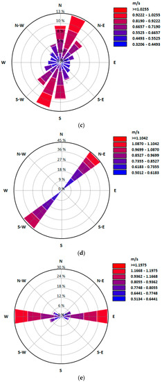 Marine current velocity rose diagrams. (a) Tanger; (b) Agadir; (c) El Hoceima; (d) Dakhla; (e) El Jadida.