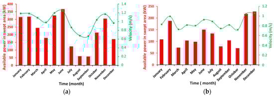 The rotor efficiency (ηR) can be supposed to increase from 40% at the cut-in velocity to attain 55% at the rated velocity. The cut-in velocity is the minimum velocity needed for machine operation and is considered constant at 0.4 m/s. This hypothesis simplifies the analysis and does not impose significant constraints on accuracy, since the accessible power from marine currents at speeds below 0.4 m/s is usually smaller than 5% of the total accessible power. Finally, the mean powertrain efficiency (ηPT) can be supposed as 80% for a HACMT. All those parameters will be used to calculate the electrical power produced in each speed bin as follows [25,26]: