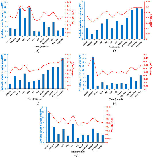 Tidal energy resource in the Mediterranean Sea. (a) 2010; (b) 2011; (c) 2012; (d) 2013; (e) 2014.