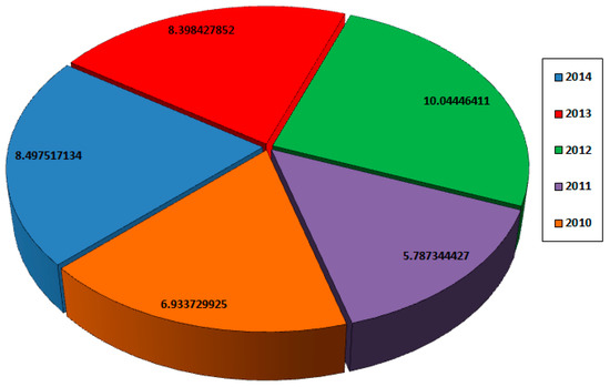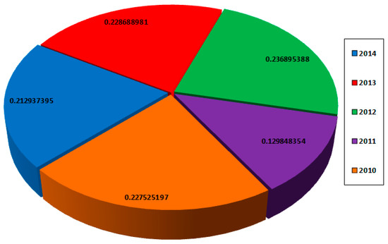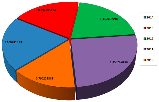 Figure 8 shows the variation of velocity and available power on the north coast of the Atlantic in Morocco. The study of the intensity of surface current in the north coast of the Atlantic has covered five years (2010–2014); it has clearly shown that the minimum intensities are almost zero. The maximum values over the five years are very coastal and between 0.235 and 0.812 m/s all concentrated in (latitude: 26.416° and longitude: −14.416°) and (latitude: 26.116° and longitude: −14.500°).
