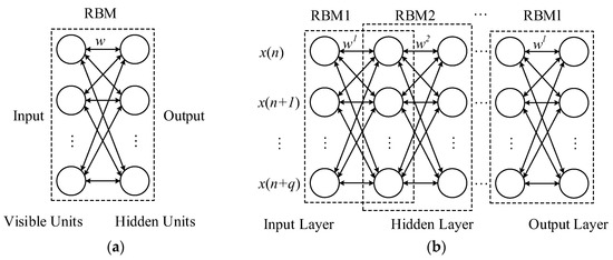 A DBN is stacked by multiple restricted Boltzmann machine (RBM) layers, and their structure are shown in Figure 1. As seen in Figure 1a, a RBM is composed of one visible layer and one hidden layer. Symmetrically weighted connections are present among the units of interlayers, and no connections occur between the neurons in the same layer [34]. As shown in Figure 1b, a DBN is stacked by l RBMs, which presents one input layer, also named visible layer, multiple hidden layers and one output layer. The visible layer of the first RBM acts as the DBN input layer; the hidden layer of the first RBM is the visible layer of the second RBM and is the first hidden layer of the DBN. Then, the hidden layer of the second RBM is the visible layer of the third RBM and the second hidden layer of DBN. This process continues, and layer-by-layer stacking occurs. Thus, a DBN with multiple hidden layers is established.