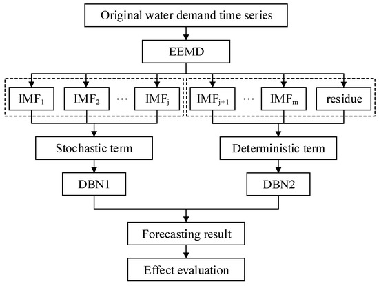 Daily urban water demand time series is a typical nonlinear and non-stationary signal. We used EEMD to extract the IMFs and residue component in the original time series of daily water demand. We reconstructed the stochastic term and deterministic term in accordance with the frequency characteristic, thereby decreasing the non-stationary of the original data. Then, we used DBN to predict the two feature terms. Finally, the prediction results of the two feature term were superimposed. The modeling structure flow chart of the DSDBN prediction model is illustrated in Figure 2.