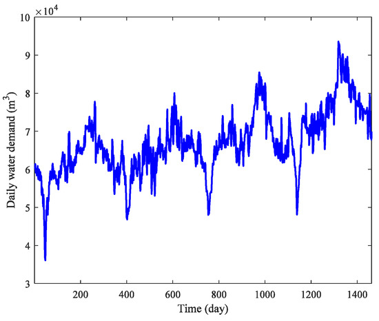 As shown in Figure 3, the daily water demand time series indicates a certain regularity as time continues. The water demand begins to decrease until the annual minimum in the winter, then increase. The highest value is reached in the summer because most enterprises indicate that their main water consumers are on holiday and decrease their water demand during China’s Spring Festival.
