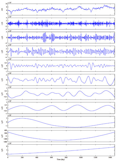 As described above, the original daily urban water demand time series is decomposed into nine independent IMF – and one residue by using the EEMD method, the decomposition results are shown in Figure 4, where the components – and are in accordance with the order from high to low frequency, and reflects the overall trend of the original daily water demand time series. The EEMD decomposition presents significant physical meaning, transforms nonlinear and non-stationary series into stationary series and facilitates improved forecasting performance.