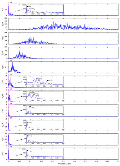 The frequency spectrum of each IMF and residue component using GFT are shown in Figure 5, wherein two main frequency components, namely, (1/day) and (1/day), are in the original daily water demand time series; different frequency components are present in –; similar frequency components in – (, and in ; , and in ; and in ); and same frequency components in , and . According to EEMD and GFT analysis results, the nine IMFs and one residue component can be reconstructed into three categories, namely, , and . The first category can be regarded as the stochastic term, whereas the latter two categories are treated as deterministic terms, that is, stochastic term and deterministic term .