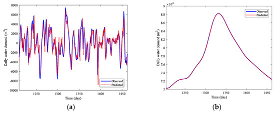 - The prediction results of the stochastic term and the deterministic term are combined. The results can be used as the final prediction result for the original daily water demand time series.