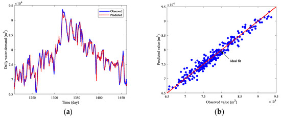 Final forecasting results of the daily water demand: (a) comparison between the predicted value and the observed value; and (b) the scatter of the predicted value and the observed value.