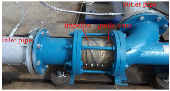 Figure 2 shows the test helico-axial pump model with its impeller and guide vane, inlet and outlet pipes. In order to observe the internal flow in this pump with a high-speed camera, the shell of the impeller and guide vane were made of organic glass, as displayed in Figure 2. Table 1 shows the dimension and design details of the multiphase pump. Here, according to the following Equations (1)–(3), the design specific speed, design discharge, and head coefficients were determined as 166, 0.168, and 0.274, respectively:
