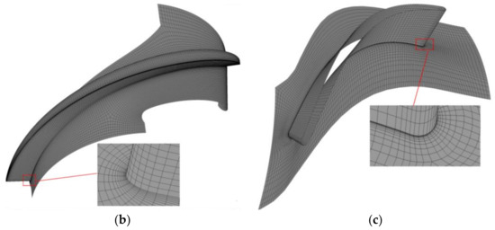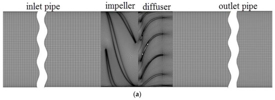 The numerical model in this study includes four parts: inlet and outlet pipes, impeller, and guide vane. The mesh of the first two parts was generated using ICEM_CFD 16.0 (SAS IP, Inc., Pittsburgh, PA, USA), while in order to improve the mesh quality, the latter two parts adopted H/J/C/O topology structures using TurboGrid 16.0 (SAS IP, Inc., Pittsburgh, PA, USA). The domain mesh for the pump model is displayed in Figure 3a, and the meshes for impeller and guide vane are shown in Figure 3b,c, respectively.