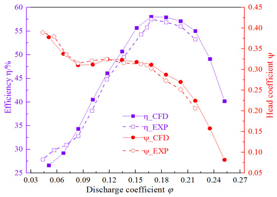Comparison of performance results between simulation and experiment (IGVF = 0%). CFD: computational fluid dynamics; EXP: experiment.