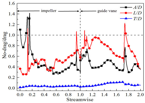 To analyze phase interaction characteristics of the gas-liquid flow in the multiphase rotodynamic pump, the area average of interphase forces were extracted along the streamwise direction. Taking the IGVF = 21% condition as an example, the magnitude ratio of non-drag forces—including added mass, lift, and turbulent dispersion—to drag along the streamwise direction is shown in Figure 5. Overall, for the interphase forces in impeller and guide vane passages, the magnitude ratio of non-drag forces to drag was generally less than 1, while it was always less than 0.2 for the magnitude ratio of turbulent dispersion force to drag, which indicates that the drag was dominant and the turbulent dispersion force was very small relative to the drag for the interphase forces in the multiphase rotodynamic pump. It can be also seen from Figure 5 that the drag force was the largest overall in the impeller and guide vane, followed by the lift and added mass forces, then the turbulent dispersion force.