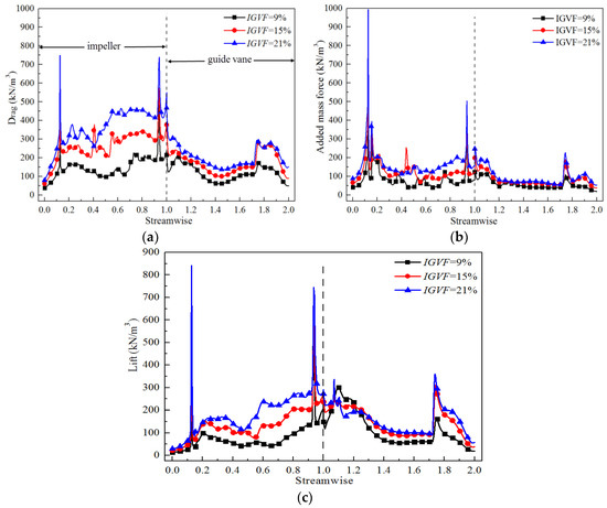 - Due to the rotation of the impeller and the rotor-stator interaction, the interphase forces of drag, added mass, and lift near the inlet and outlet of the impeller increased significantly. Meanwhile, with the increased IGVF, the variation range of interphase forces in the impeller was greater than that in the guide vane.