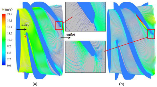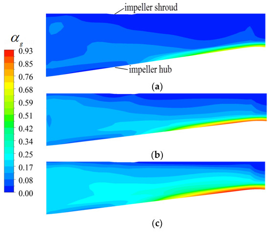 It can also be seen from Figure 9 that the gas mainly accumulated near the hub of the impeller outlet. This is partly due to the action of the impeller. The gas moves toward the impeller outlet and also suffers from an adverse pressure gradient, thus resulting in a reverse flow of gas near the hub of impeller outlet, as presented in Figure 10a,b respectively. On the other hand, because the pressure near the impeller shroud is greater than that in the impeller hub, the gas in impeller suffers from a pressure difference from shroud to hub. The above reasons result in the gas mainly accumulating near the hub of impeller outlet. Then, combined with the calculation expressions, the gas accumulation near the hub of impeller outlet will enlarge the interphase forces therein, which is in accordance with the analysis of Figure 6.
