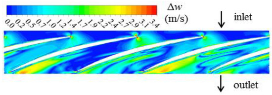 Distribution of velocity difference between the two phases in the impeller at IGVF = 21% (span = 0.5).