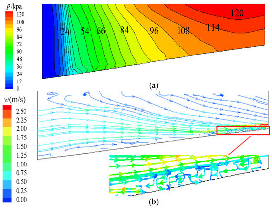 Pressure and streamlines distribution of S2 stream surface in middle of the impeller (IGVF = 15%). (a) Pressure distribution of S2 stream surface in the middle of the impeller; (b) Streamlines distribution of S2 stream surface in the middle of the impeller.