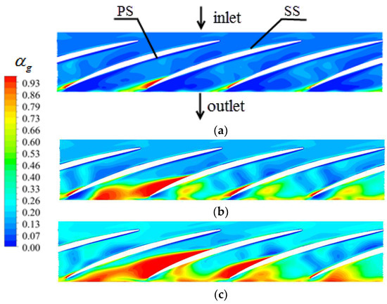- The regularities of gas distribution in the guide vane were similar at different IGVFs, mainly accumulating near the guide vane hub, and gradually spreading to the mainstream region along the streamwise direction. Additionally, due to the divergent structure of the guide vane, obvious vortexes emerged at the hub. With increased IGVF, the degree of aggregation of gas and the range of gas vortexes—which are both located near the guide vane hub—became larger.