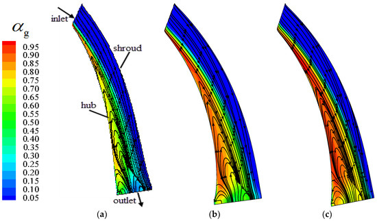 Gas void fraction and 3D streamline distributions of S2 stream surface in the middle of the guide vane at different IGVFs. (a) IGVF = 9%; (b) IGVF = 15%; (c) IGVF = 21%.