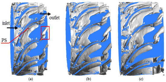 In the present study, the Q-criterion was used to further explore the vortexes structure in the guide vane. Figure 13 shows the structure of gas vortexes in the guide vane at different IGVFs, and the magnitude of the iso-surface Q was calculated by the following expressions [31,32]: