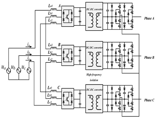 In the past decades, the multilevel converter based on the high frequency transformer has rapidly developed [4,5,6,7], and by using a cascaded H-bridge converter (CHB), it could achieve direct connection to the high voltage power grid. What is more, the use of CHB generates many extra advantageous characteristics, such as better power quality and flexible control of the output voltage [8]. The primary disadvantage of this kind of multilevel converter is that numerous fully-controlled semiconductor devices and dc capacitances are required [9], thus increasing the system control complexity and costs.