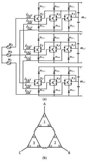 The triple LVC-VC is operated in Figure 2a, and as shown, three VIENNA-rectifier modules bridges are interconnected in a line voltage series connection mode. , are three-phase power supply voltages; (i = 1, 2, 3) represent the ac-side filtering inductance of the three VIENNA rectifiers; are the three dc-link voltages; (x = a, b, c) are the dc-link capacitances, assuming they are all have an equal value C; and are the loads of the three VIENNA rectifiers. Figure 2b shows the simplified connecting structure of LVC-VC.