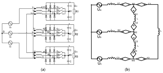 With a combination of Figure 3b and Equation (2), a three-phase delta connected cascaded VIENNA rectifier could be equivalent to the three phase star-connected circuit in Figure 5.