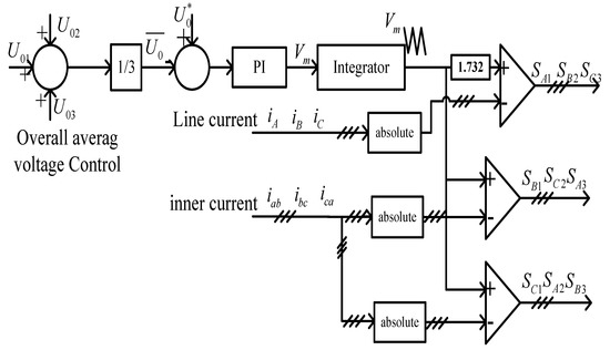 Equation (25) indicates that each dc-link voltage is composed of two parts, where the first part represents the direct current component of the dc-link voltage or the average value of , and the other one with a double fundamental frequency stands for the ac component of dc-link voltages.