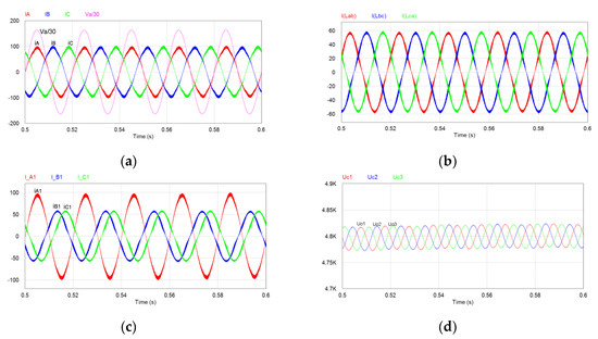 Figure 9 shows the currents flowing through different branches. Figure 9a shows the three input line currents which are flowing symmetrically with sinusoidal waveforms. Figure 9b displays the three inner currents flowing through three inductors in Δ connection, as shown in Figure 3. Figure 9c displays the three input currents of the VIENNA rectifier module 1. It can be seen that one of the three is the line current, and the other two are phase currents. The three dc-link voltages are shown in Figure 9d, which are have an equal average value (4800 V) with approximately 40 V fluctuation, so the switch voltage stress is 50 percent of the dc-link voltages, with a value of only 2500 V.