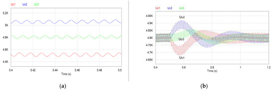 In Figure 10a, the dc-link voltages are unbalanced when the loads are unbalanced. A balanced recovery transient is shown in Figure 10b, where the LVC-VC initially operates with a balanced load, at t = 0.5 s. When the three loads change from to , the dc-link voltages then became severely imbalanced. However, regulated by one circle control based controller with the aforementioned voltage balancing control scheme, the three dc-link voltages converge to the same average value with an approximate transient time of 1 s.