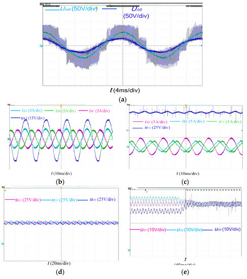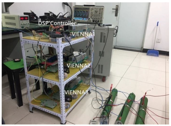 All the experimental waveforms were taken in an experimental development platform shown in Figure 11, where the controller is the DSP. Experimental waveforms were obtained from the 300VA downscaled model in Table 4. Voltage and current waveforms correspond to those in Figure 12. These figures indicate: (1) the line-line voltage between two VIENNA units (see Figure 12a); (2) the power factor correction (see Figure 12b); (3) the ac-side currents and the dc-link voltage of VIENNA rectifier unit 1 (see Figure 12c); (4) the three dc-link voltages in balanced loads (see Figure 12d); and (5) three dc-link voltages of the proposed converter under three unbalanced dc loads, shown in Figure 12e. The purpose of Figure 12e is to verify the validity of the balancing control scheme through injection of some zero sequence current. Figure 12e shows three dc-link voltages of the proposed converter under three unbalanced dc loads. At first, the three dc-link voltages are unbalanced, but after injecting a zero sequence current, the three dc-link voltages gradually become balanced.