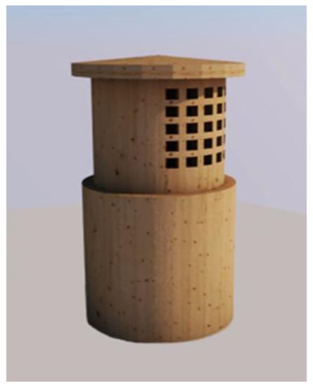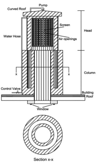 - Column: The column of the wind tower is fixed. It can be installed on top of the building. There is a space between internal and external parts of the column (Figure 5, section x-x), and the wind tower’s head can be placed inside it.