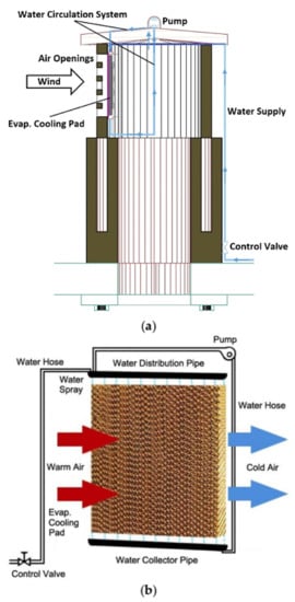 Figure 6. A schematic illustration of (a) installation position of moistened pad in the wind tower and (b) water distribution system as well as air cooling by the moist pad. - Windows: To control the airflow entering the building, two sliding windows are installed at the bottom of the wind tower’s column. These can be opened or closed manually or automatically.