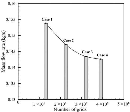 The physical model is composed of several computational domains with different geometric configurations. Grids are created for each domain and then connected to generate the whole grid. Several versions of the computational mesh are generated to examine grid independency. A suitable number of cells is selected as a trade-off between the computing resources cost and the simulation results. When the finer grids do not change, the refined grid is considered to have an appropriate grid independency level (Figure 9). The mass flow rates for case 3 and 4 are approximately the same, and since case 3 has the lowest computational costs, it is considered as the best choice. It should be noted that case 3 is also acceptable for the other inlet wind velocities, including limits of 0.1 m/s and 4 m/s. Figure 10 illustrates the grid generation on different planes in the computational domain. To address the issue of complex geometry, combinations of structured and unstructured tetrahedral (T-grid) grids are used for the whole computational domain.