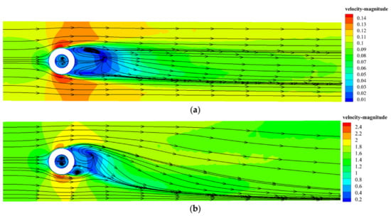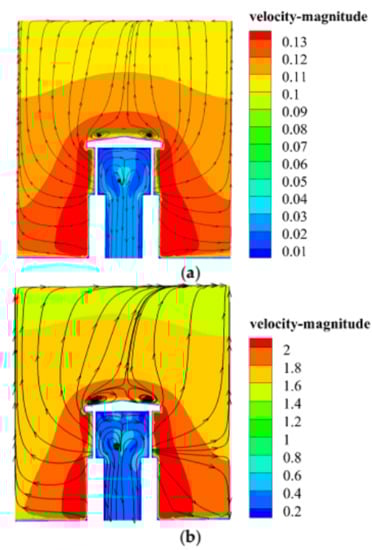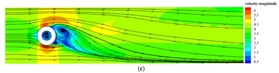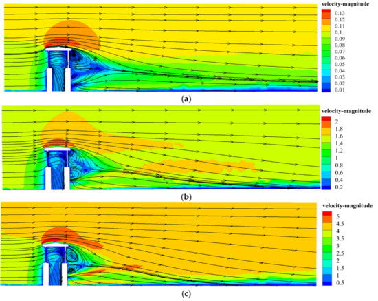 Distribution of velocity and streamlines evolution in xy-plane for different inlet wind velocities: (a) 0.1 m/s; (b) 1.5 m/s; and (c) 4 m/s.