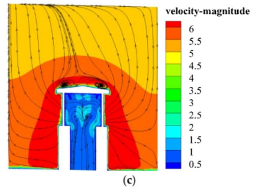 According to Figure 11, Figure 12 and Figure 13, the separation region inside the wind tower’s column is very small; therefore, the effective space for passing airflow within the column is large enough. The length of the channel is extended sufficiently to prevent reverse flow in the outlet. Hence, the effect of the wind tower in the outlet is negligible. The wake region on the backside of the wind tower dissipates substantial energy. Also, eddies inside the wind tower, though small, can reduce its efficiency. By increasing wind velocity, at least two main improvements in the wind tower efficiency can occur. First, eddies inside the wind tower will be relatively smaller, so the wind tower efficiency will improve. Second, the impact of the wake region on energy dissipation at the backside of the wind tower will decrease.