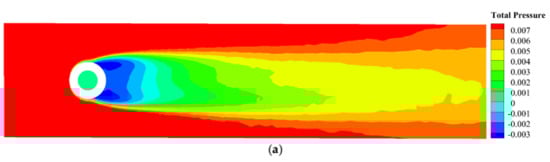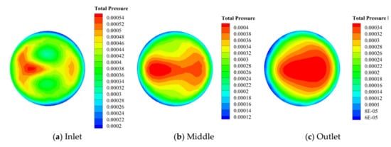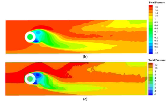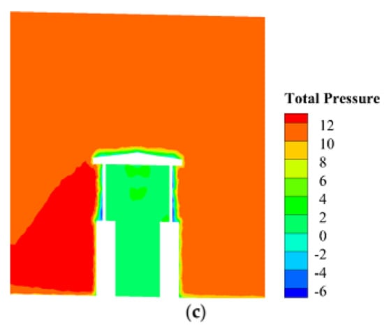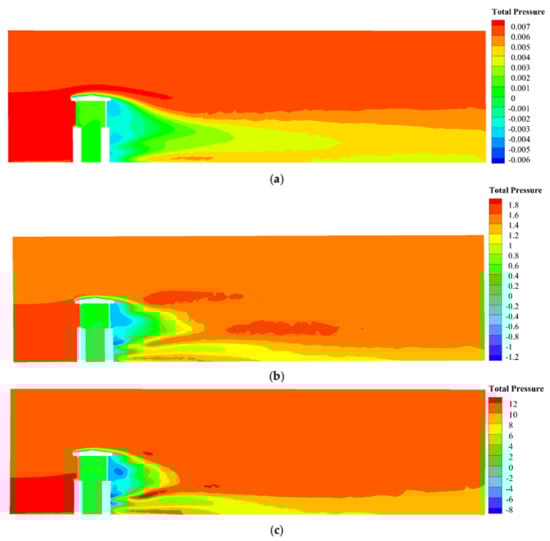 Distribution of total pressure in xy-plane for different inlet wind velocities: (a) 0.1 m/s; (b) 1.5 m/s; and (c) 4 m/s. In this figure, the unit of total pressure is kPa.
