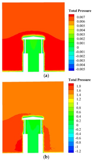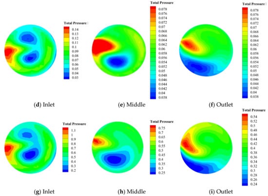 Figure 20 shows the total pressure distribution at the inlet, middle, and outlet of the wind tower’s column for three wind velocities. As illustrated in Figure 20a–c, the pressure distribution within the wind tower’s column for the wind velocity of 0.1 m/s is approximately symmetric. As seen in Figure 20d–f, the pressure distributions inside the wind tower’s column are non-uniform. At high wind velocities, the pattern of pressure distribution for various levels on the inside of the wind tower’s column is different (Figure 20g–i).
